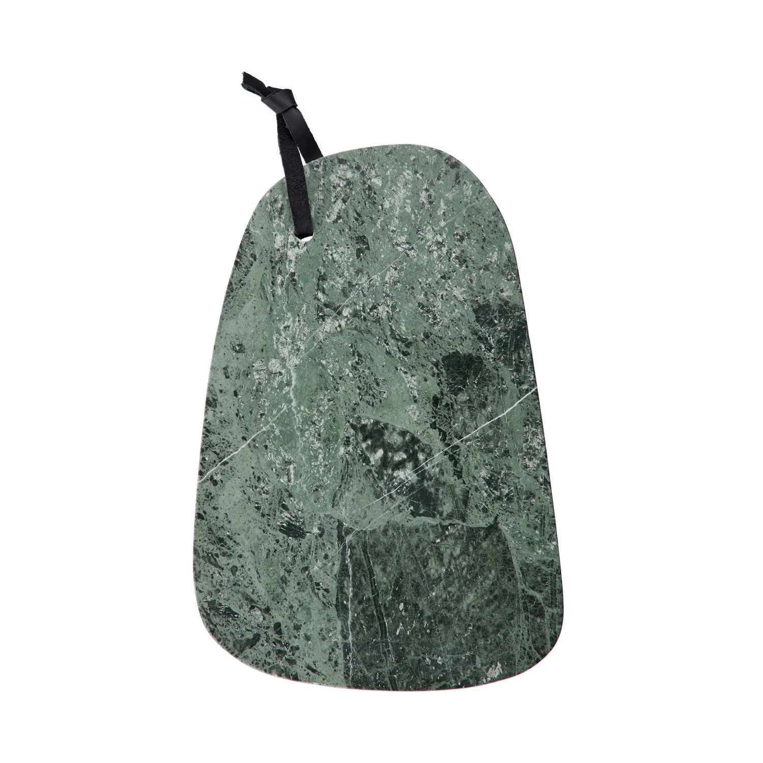 Nach dem Vorbild der Natur: Das Marble Schneidebrett aus echtem Marmor in Grün kommt ohne Ecken und Kanten in organischer Form daher. Der edel gemaserte Stein und die hochwertige Optik werden durch das Lederband noch unterstrichen. Deshalb darf das Schneidebrett auch nach dem Kochen oder Essen gerne noch dekorativ auf dem Tisch oder auf der Arbeitsfläche liegen bleiben.